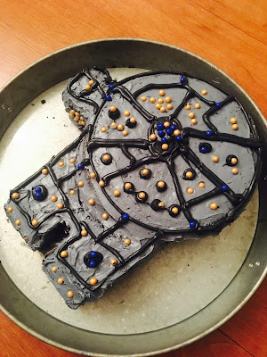RF's Millennium Falcon birthday cake. I am in no way a baker, but its what he wanted, so I made it. RF woke up really early the morning of his birthday party, so he helped me decorate it with the gold and blue sugar balls.